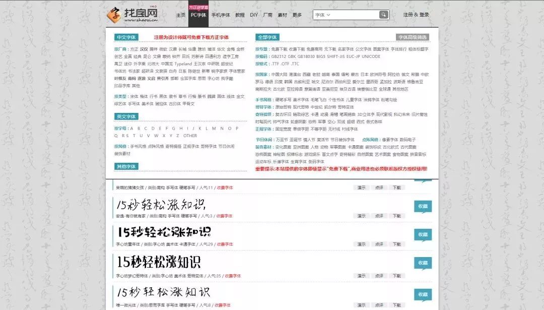 找字网是一个大型的字体分享网站,几乎所有知名的中文字体都可以在这个网站上找到。并且网站提供了预览功能